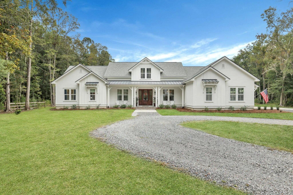 5.09 New Lowcountry luxury custom home on a private 5-acre property in an exclusive gated community. Just over a year old and immaculately kept. Drive by moss-covered live oaks and a pond before making your way to a circular drive and sweeping Southern home. Past a large front porch is an airy open concept floor plan with 10ft ceilings and molding throughout, along with built-ins, designer fixtures and luxury finishes. Chef's kitchen with ceiling-height cabinets, 10ft custom island, GE Cafe appliances, Mother of Pearl backsplash and butlers pantry. Each bedroom with ensuite bath and Delta Champagne Gold fixtures. Step through French doors to an expansive screened porch with fireplace. Enjoy total privacy while watching roaming turkeys, deer, and more, all just a short drive to amenities.