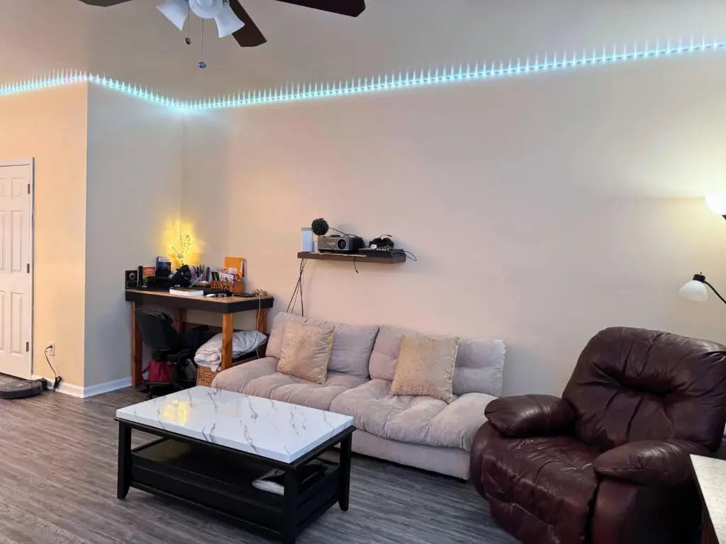 0.04 **Charming & Modern Townhome - A Must-See!**Welcome to this spacious 2-bedroom, 2.5-bathroom townhome, where comfort meets style! Each bedroom boasts its own private bathroom, offering convenience and privacy for all. Step inside and be greeted by a welcoming foyer that leads to an open-concept family room and dining area, all featuring stunning waterproof luxury vinyl plank flooring and smooth 9-ft ceilings for a bright, airy feel.The kitchen is a chef's dream with granite countertops, sleek stainless-steel appliances (less than 3 years old), and thoughtful updates like new cabinet hardware and modern light fixtures. Freshly painted throughout, this home is move-in ready! Relax or entertain in the backyard oasis, complete with a covered porch and full privacy fence--perfefor quiet evenings or lively gatherings. And the best part? **NO HOA FEES!** This gem is packed with upgrades and situated in a prime location. Don't waitschedule your tour today! This home won't be on the market for long!