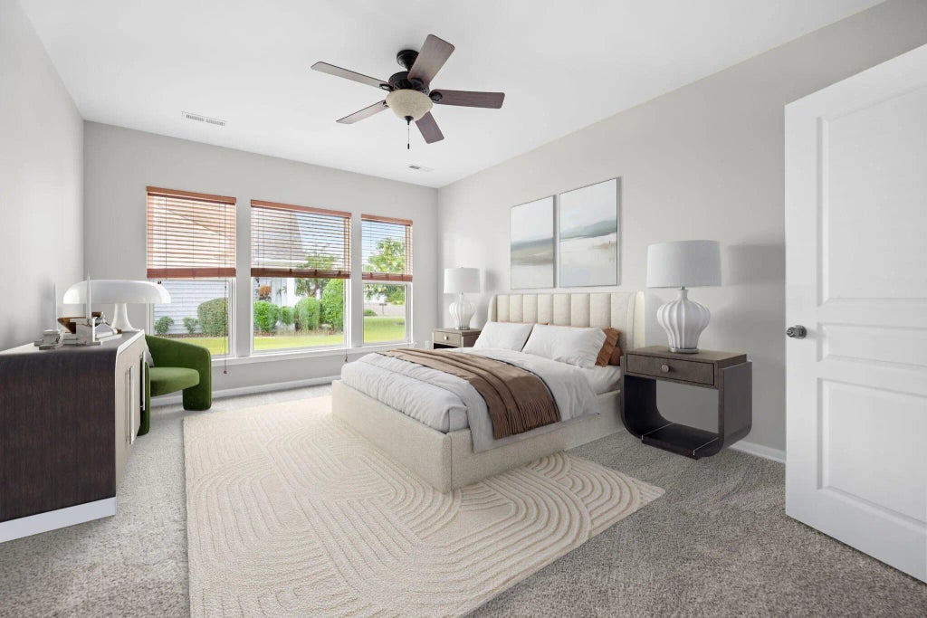0.25 Welcome to resort-style living in this beautifully maintained 3-bedroom, 2.5-bath home, perfectly situated on a desirable corner lot in the sought-after Del Webb community of Cane Bay.From the moment you arrive, the charming front porch and abundance of windows fill the home with natural light, creating an inviting atmosphere. Inside, you're greeted by a dedicated office space, ideal for working from home or a quiet study. The thoughtfully designed kitchen features an island, breakfast bar, and attached eat-in area -- perfect for entertaining or enjoying your morning coffee. For larger gatherings, a separate dining room offers additional space for hosting.Storage is abundant with custom cabinets in the laundry room and a mudroom drop zone, keeping coats, shoes, and everydayessentials organized. The spacious living room is bathed in natural light, complemented by brand new carpet and fresh paint throughout the home. An added sunroom offers the perfect spot to relax with your morning coffee or provide extra room for entertaining. The generous primary suite includes a ceiling fan, walk-in closet, and a spa-like ensuite bath complete with a soaking tub and separate shower. Two additional bedrooms share a convenient Jack-and-Jill bathroom, ideal for guests or family. Del Webb at Cane Bay is a gated, golf cart-friendly community offering world-class amenities including resort-style pools, tennis courts, a fitness center, miles of walking and jogging trails, and a vibrant calendar of community eventsall just minutes from shopping, dining, and everyday conveniences. Don't miss your chance to enjoy the best of Lowcountry living in one of the area's premier active adult communities!