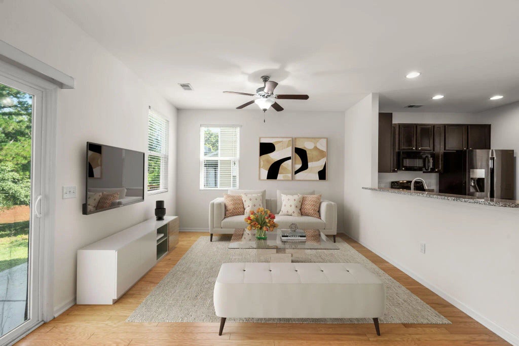0.08 Welcome to your dream home! This meticulously maintained end-unit townhouse offers the perfect blend of modern living and natural tranquility. Freshly painted throughout, this inviting residence greets you with gleaming hardwood flooring that enhances the spacious main living area, creating an atmosphere of warmth and elegance.The heart of this home is its open floor plan, designed for both comfort and functionality. The upgraded cabinets and stunning granite countertops in the kitchen provide a stylish yet practical space for culinary creations. With a convenient sliding glass door leading to the rear patio, you can easily enjoy your morning coffee or entertain friends.The patio not only offers a serene escape, but it also features additional storage for all your outdoor essentials. Privacy is paramount here, as the townhouse is thoughtfully backed up to a lush wooded area, ensuring a peaceful retreat from the hustle and bustle of daily life. All bedrooms are located upstairs, allowing for a quiet sanctuary away from the common areas. The large primary bedroom is truly a standout feature, boasting vaulted ceilings that elevate the space and double walk-in closets that cater to all your storage needs. The en-suite bath is a private oasis, perfect for unwinding after a long day. Two additional guest bedrooms provide ample space for guests or a home office, and are accompanied by a well-appointed full bathroom. This townhouse is not just a home; it's a lifestyle. Location is key, and this gem is ideally situated close to shopping, a variety of restaurants, Boeing, Charleston International Airport, and the Charleston Air Force Base. The HOA covers Lawn maintenance, Yearly Pressure washing and termite bond! Don't miss this incredible opportunity to own a piece of paradise in a fantastic LOW MONTHLY HOA community. Schedule a viewing today and step into the next chapter of your life in this delightful townhouse that combines comfort, convenience, and charm. Your new adventure awaits!