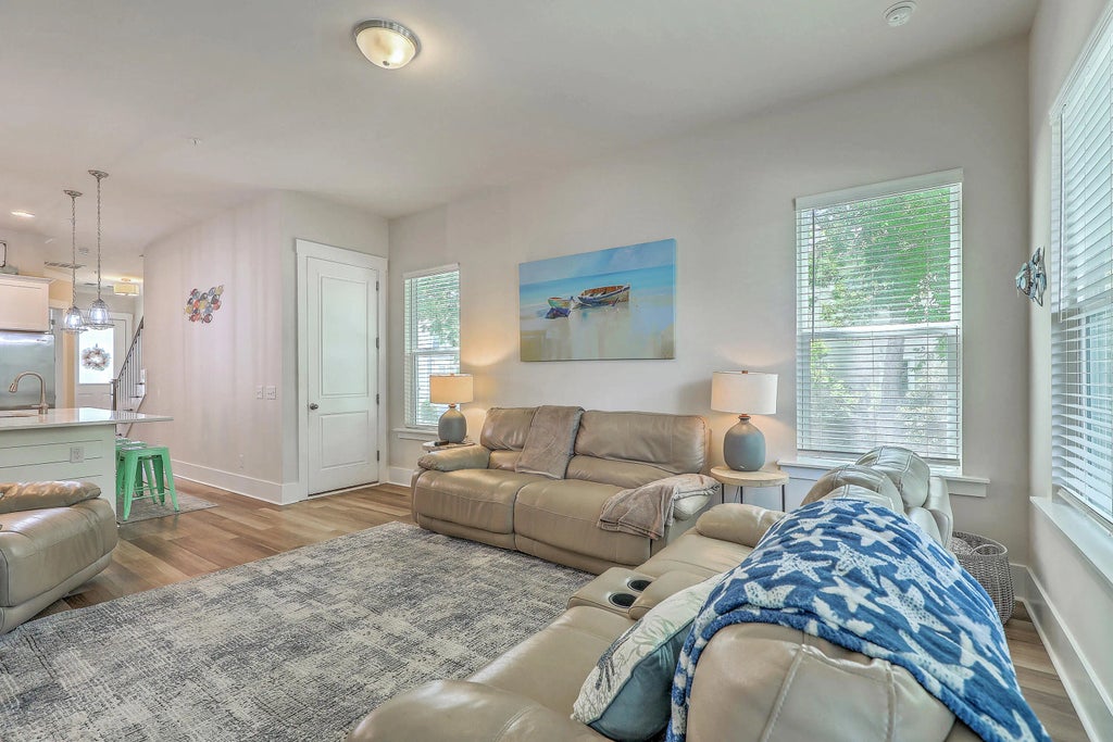 1664 Absolutely Gorgeous townhome two miles to Folly Beach. Built in 2019 this home is immaculate. Lovely luxury vinyl plank flooring throughout first floor, island in the kitchen, SS appliances, fireplace with gas logs in family room and porch overlooking the lagoon fountains. Bedroom on main floor and full bathroom. Primary bedroom upstairs with beautiful bathroom with soaking tub and separate shower and dual sinks and private porch. 3rd bedroom has full bathroom. Large two car garage with L-shaped plan that owners have made a flex space with a wall unit. Covered patio with outdoor shower. Refrigerator, washer and dryer convey. Monthly $610 HOA covers exterior maintenance, building and flood insurance, landscape, termite bond and exterior pest control, common areas including a firepit and