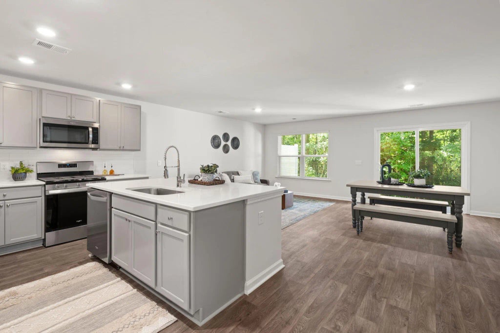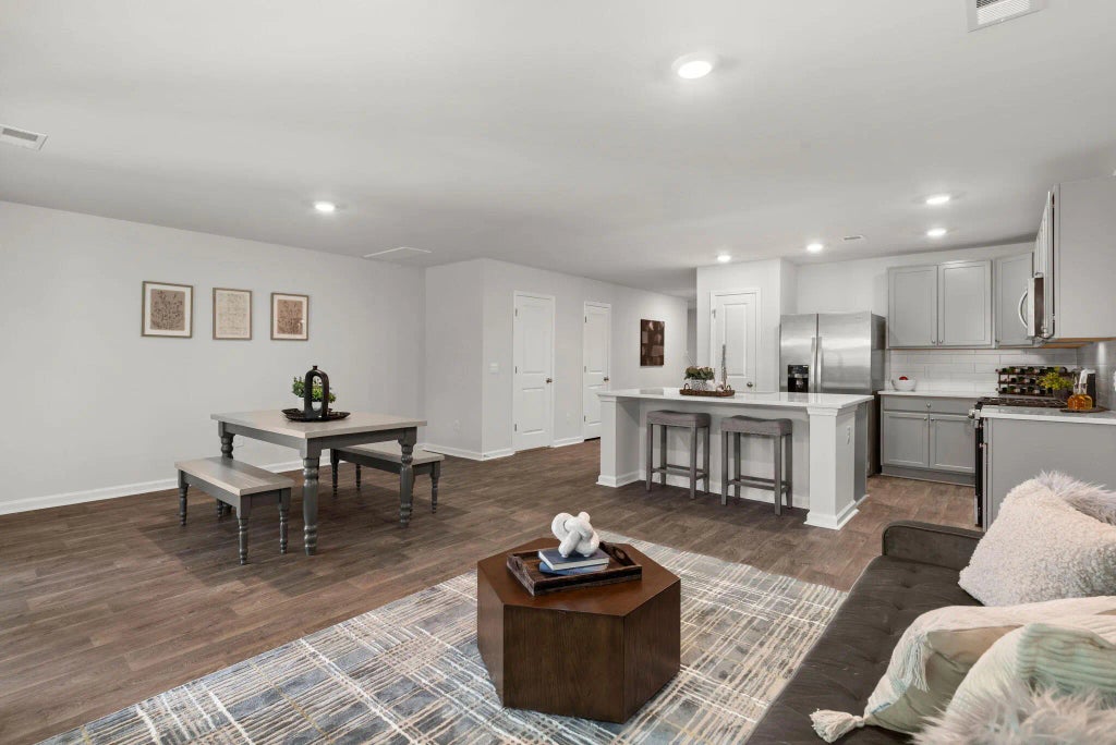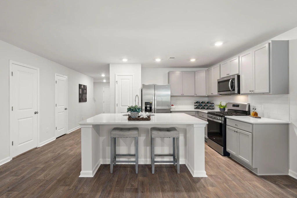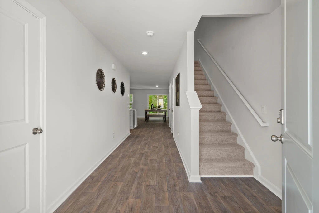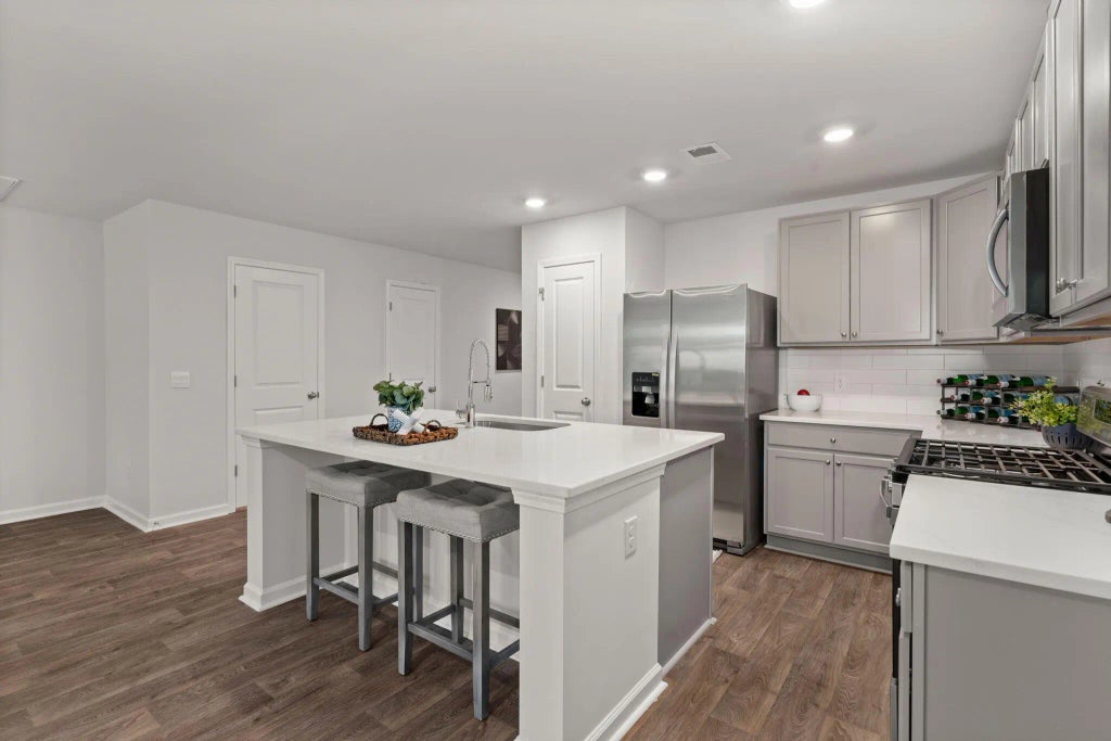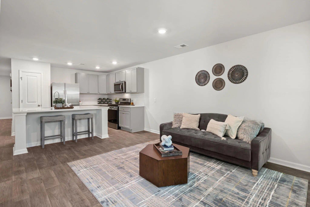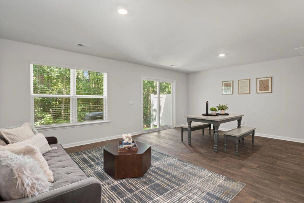 0.05 Nestled in the heart of Moncks Corner, this impeccably designed townhome offers a luxurious and low-maintenance lifestyle. A wide driveway welcomes you home, providing ample parking for guests. Step inside and be captivated by the grandeur of soaring ceilings and rich flooring that flows throughout the main living area. The gourmet kitchen is a chef's dream, showcasing sleek quartz countertops, a stylish tile backsplash, and matching gray cabinetry. Gleaming stainless steel appliances, including a desirable gas stove, complete this culinary haven. The open-concept design seamlessly integrates the living and dining spaces, creating an ideal setting for entertaining.A sliding glass door extends the living area outdoors to a private, wooded backyard oasis, perfect for relaxing and enjoying the serene surroundings. Ascend the staircase to discover the generously sized bedrooms. The primary suite is a true retreat, boasting vaulted ceilings and an abundance of space to personalize your sanctuary. The spa-like ensuite bathroom is adorned with a fully tiled shower and elegant flooring, while a spacious walk-in closet caters to your storage needs. Two additional well-appointed bedrooms share a stylishly updated bathroom featuring double vanity sinks. Offering all the benefits of new construction without the wait, this townhome presents a rare opportunity to experience modern living at its finest. Don't miss your chance to call this exceptional property home. Schedule your private showing today.