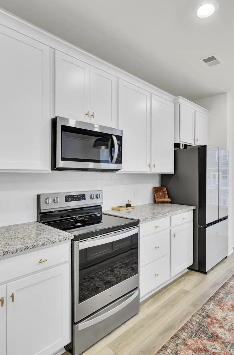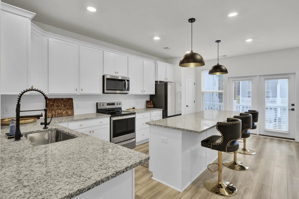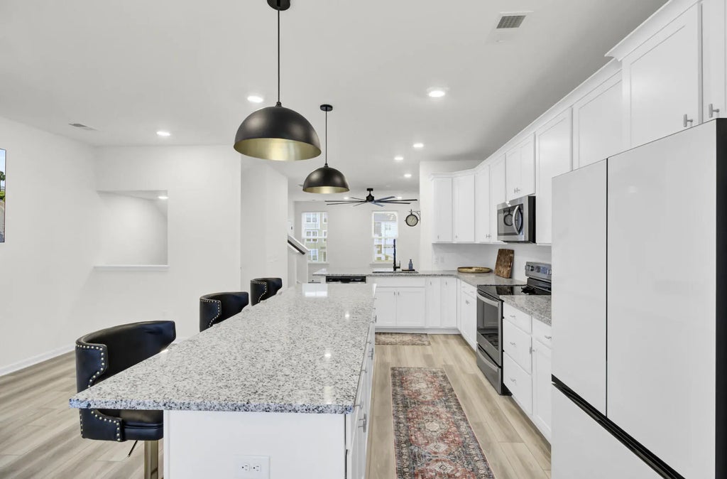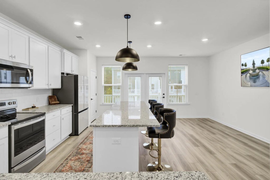 1900 Welcome home to a ready to move in, like-new 3-story townhome filled with modern upgrades and flexible living spaces. The first floor features a private study/bonus room with a full bathroom and access to the garage, which is equipped with a Della mini-split systema''perfect for a home gym or theater setup. A 55'' Samsung TV is already mounted and included. The garage also comes with a brand-new, in-box side-mount garage door opener for improved ceiling clearance, perfect for larger vehicles.The second floor offers an updated kitchen with LVP flooring, granite countertops, modern fixtures, and a Samsung white glass-front refrigerator. The bright, open living area includes a huge ceiling fan, two mounted 77'' Samsung TVs, and access to a balcony with peaceful lake and community pool view. All windows are ceramic tinted to help improve energy efficiency and reduce electric costs. The third floor includes two secondary bedrooms, an updated hall bathroom, a laundry room with a brand-new Samsung top-load washer and dryer, and a spacious primary suite. The primary bedroom offers a large walk-in closet, a huge ceiling fan, and a fully updated bathroom with an oversized stand-up shower. Community amenities include a pool, playground, dog park, fire pit area, and a dock with gazebo for fishing and relaxation. Conveniently located near shopping, dining, and everyday essentials.