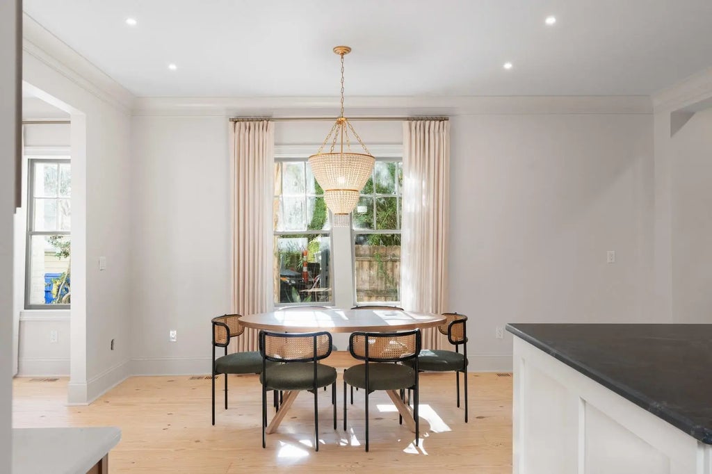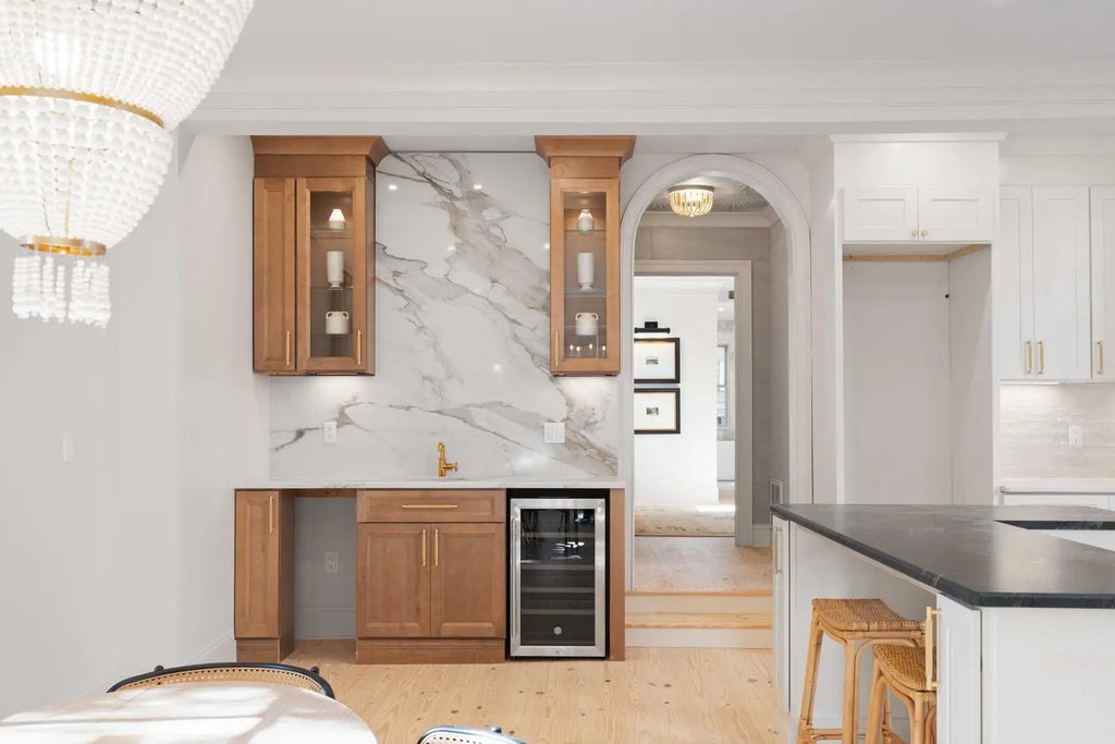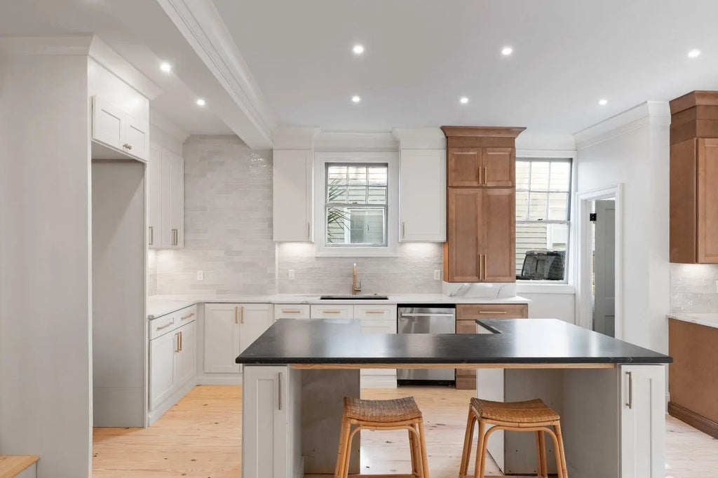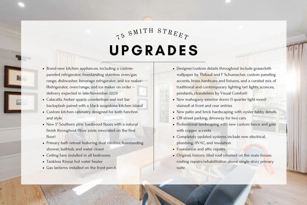 0.09 75 Smith Street is a newly renovated, move-in-ready home in historic downtown Charleston. Every inch of this property has been thoughtfully redesigned to blend historic charm with elevated modern luxury. Sunlight pours through generously sized windows, illuminating the soft neutral palette, wide-plank wood floors, and refined architectural details found throughout. Arched doorways, curated lighting, and custom millwork create a sense of warmth and sophistication from the moment you step inside. The living room is bright and airy, with a tiled fireplace anchoring the room.The kitchen serves as a true showpiece, featuring soapstone and quartz countertops, warm wood cabinetry, brass hardware, a built-in wine cooler and ice maker, plus a stunning wet bar with a sculptural brass faucet and quartz backsplash. The primary suite is a showstopper and conveniently located on the main living level at the rear of the home. The luxurious primary bath features a soaking tub, marble shower, two vanities and a separate water closet. Dual walk in closets complete the primary suite. Upstairs are three bedrooms, each with large windows that capture views of mature trees. One bedroom features an en suite bathroom with reeded vanity and tiled shower. Two other bedrooms share a hall bathroom with tub/shower combo, brass fixtures, textured wall coverings, and boutique style lighting. The upper hallway feels bright and gallery-like, enhanced by brass sconces, recessed lighting, and a beautifully crafted staircase railing. Striking teal cabinetry at the end of the upper hallway provides terrific flex space for an office or small play area. Outside, a private courtyard with mature trees, fresh landscaping, beautiful new fencing, charming brick lined pathways, and a fire pit creates a tranquil outdoor retreat perfect for relaxing or entertaining. There is off-street parking. Completely transformed from top to bottom, 75 Smith offers the rare opportunity to own a timeless, elegant home that is truly turnkeycombining modern comfort, impeccable finishes, and historic character in one exceptional property.