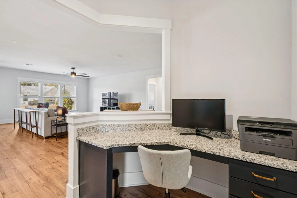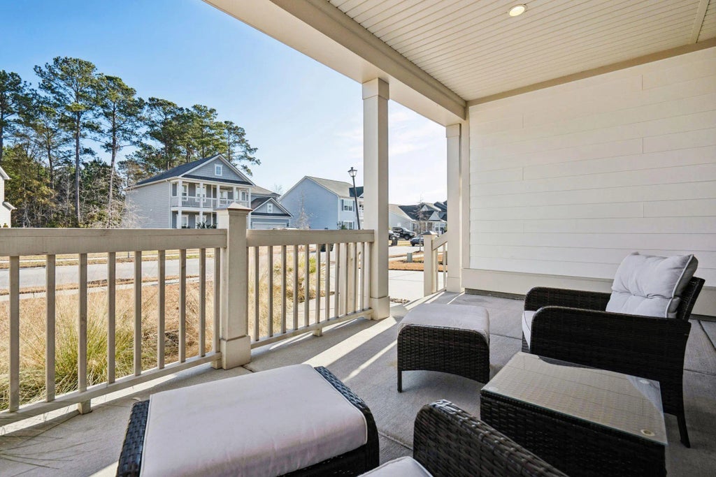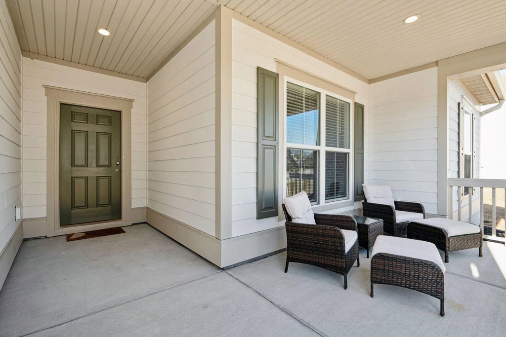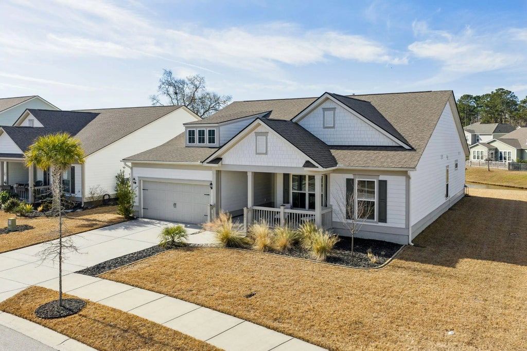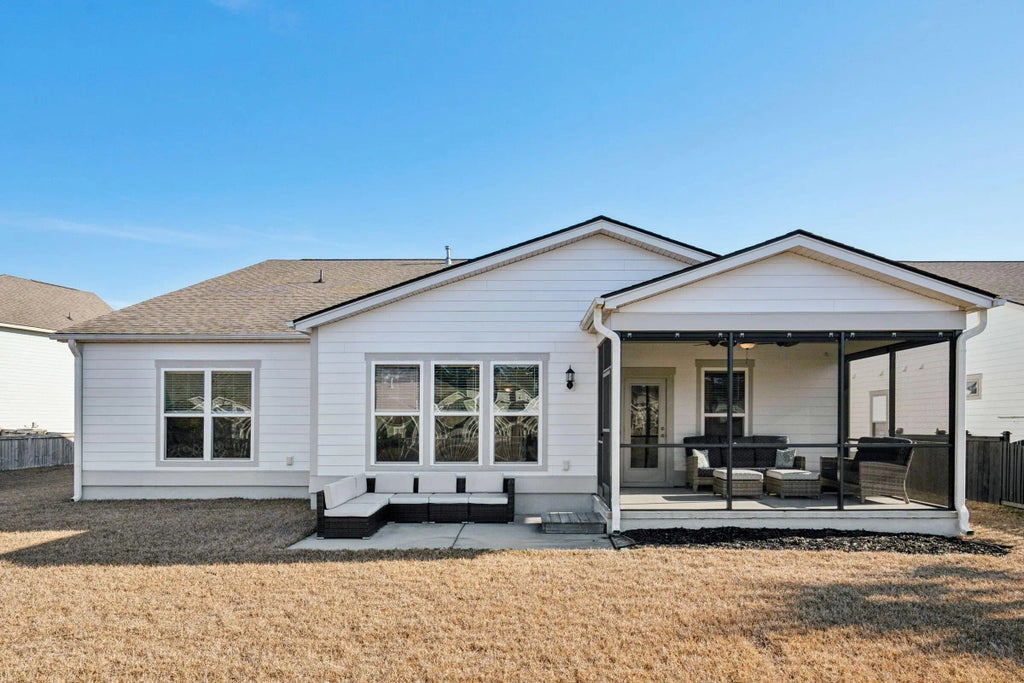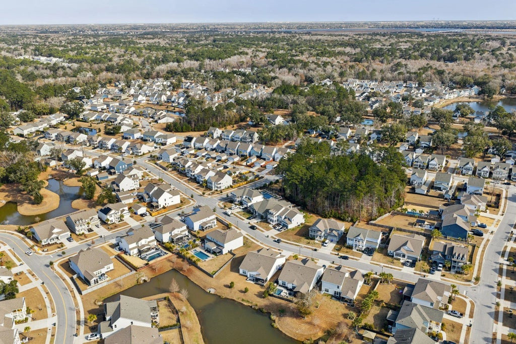 0.20 Single-story living and pond views are standout features of this 2021 Pulte-built Amberwood plan in Oakfield, introduced by an expansive covered front porch and clean coastal exterior. One of the few true one-level homes available in the neighborhood, it offers everyday convenience without stairs. A wide driveway provides generous off-street parking alongside the two-car garage, while the owners' consistent care of the lawn enhances the home's curb appeal and welcoming presence. Stepping inside, the foyer features wainscoting and custom built-in storage and opens to a private office enclosed by glass French doors. Crown molding and matching wainscoting details give the space both character and functionality, creating a comfortable work-from-home setting, library, or quiet retreat whileremaining connected to the front of the home. Just past the office, a hallway to the right leads to the secondary bedroom wing. A convenient half bath is positioned along the hall, while the corridor continues to a spacious bedroom and then turns toward a full bathroom with a double vanity and another well-sized bedroom, creating comfortable separation from the main living areas. Returning toward the foyer, the entry from the two-car garage is positioned opposite the bedroom hallway and connects to the laundry room. Both the garage and laundry include utility sinks, and the garage also features overhead storage that will remain, adding practical everyday functionality. The home then opens into the main living space where the gathering room, dining area, and gourmet kitchen connect in one continuous layout overlooking the backyard and pond. The kitchen is centered around a large island with quartz countertops, subway tile backsplash, and stainless appliances, while the four-foot rear extension enhances the living area and creates an open, comfortable space for both everyday living and entertaining. Just off the kitchen, the planning center provides a convenient workspace and leads to the flexible fourth bedroom, which can serve as a guest room, hobby or music room, playroom, second office, fitness space, or den, plus more depending on your needs. Tucked privately at the back of the home, the owner's suite overlooks the pond and includes a spacious bath with double vanity, quartz countertops, a soaking tub, and separate shower, along with a massive walk-in closet, creating a comfortable retreat separated from the secondary bedrooms. Off the main living area, a covered screened lanai and extended patio overlook the serene pond, providing a comfortable outdoor space for relaxing or gathering. Located within the Oakfield community, residents enjoy access to a neighborhood pool, clubhouse, and walking trails while remaining conveniently positioned to Johns Island dining, shopping, and routes leading toward downtown Charleston and area beaches.