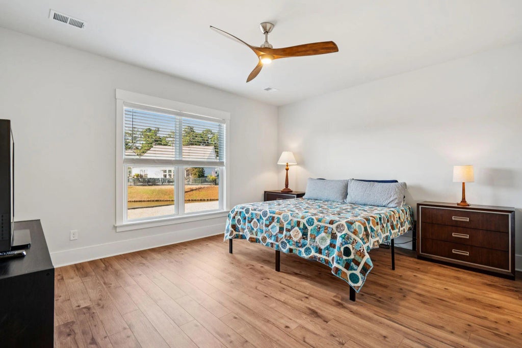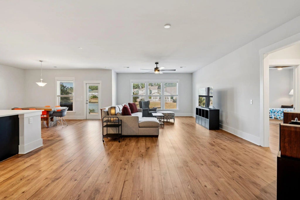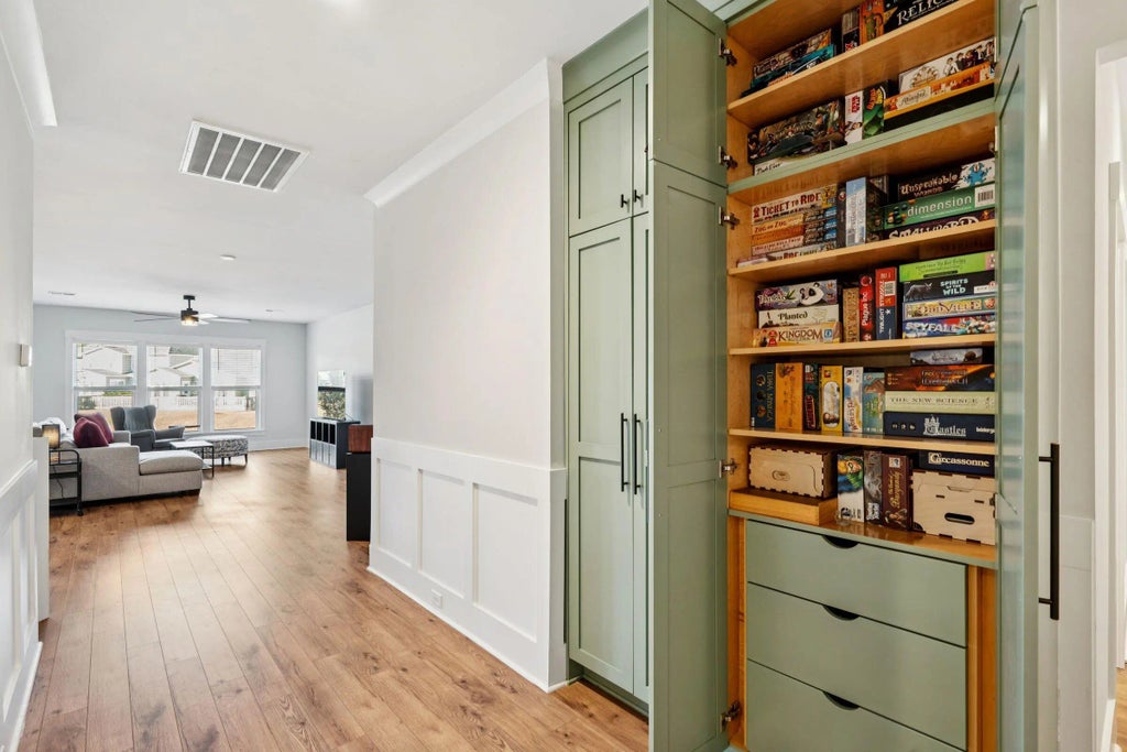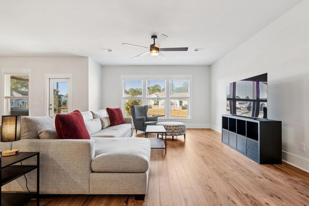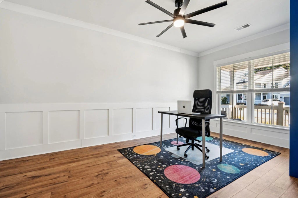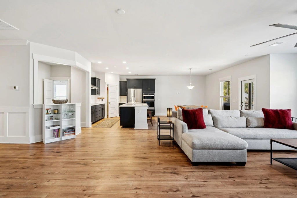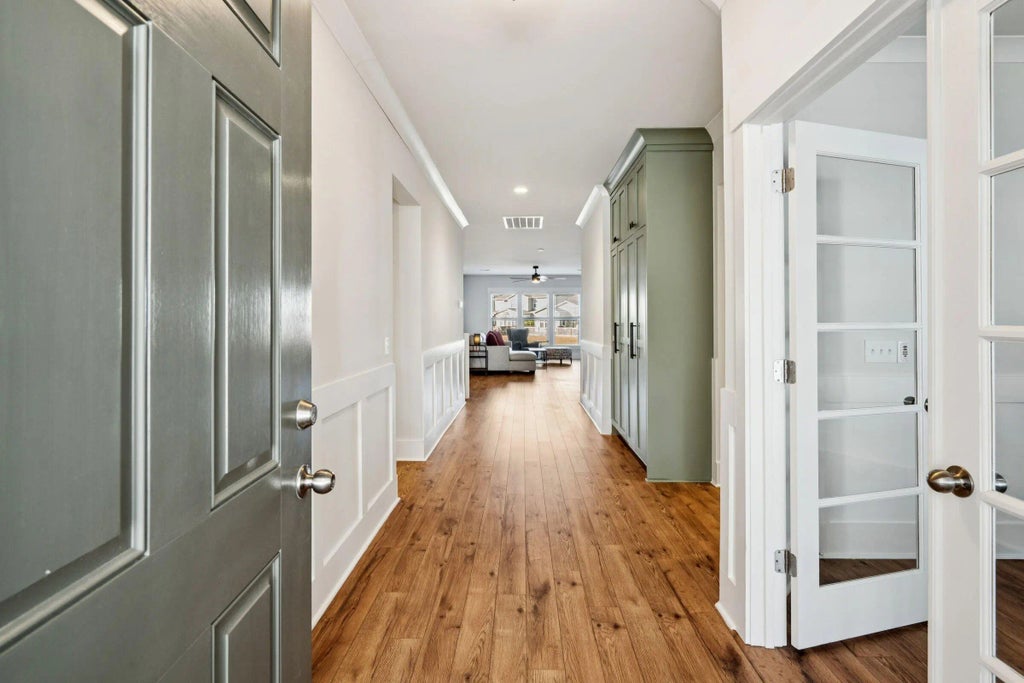 0.20 Single-story living and pond views are standout features of this 2021 Pulte-built Amberwood plan in Oakfield, introduced by an expansive covered front porch and clean coastal exterior. One of the few true one-level homes available in the neighborhood, it offers everyday convenience without stairs. A wide driveway provides generous off-street parking alongside the two-car garage, while the owners' consistent care of the lawn enhances the home's curb appeal and welcoming presence. Stepping inside, the foyer features wainscoting and custom built-in storage and opens to a private office enclosed by glass French doors. Crown molding and matching wainscoting details give the space both character and functionality, creating a comfortable work-from-home setting, library, or quiet retreat whileremaining connected to the front of the home. Just past the office, a hallway to the right leads to the secondary bedroom wing. A convenient half bath is positioned along the hall, while the corridor continues to a spacious bedroom and then turns toward a full bathroom with a double vanity and another well-sized bedroom, creating comfortable separation from the main living areas. Returning toward the foyer, the entry from the two-car garage is positioned opposite the bedroom hallway and connects to the laundry room. Both the garage and laundry include utility sinks, and the garage also features overhead storage that will remain, adding practical everyday functionality. The home then opens into the main living space where the gathering room, dining area, and gourmet kitchen connect in one continuous layout overlooking the backyard and pond. The kitchen is centered around a large island with quartz countertops, subway tile backsplash, and stainless appliances, while the four-foot rear extension enhances the living area and creates an open, comfortable space for both everyday living and entertaining. Just off the kitchen, the planning center provides a convenient workspace and leads to the flexible fourth bedroom, which can serve as a guest room, hobby or music room, playroom, second office, fitness space, or den, plus more depending on your needs. Tucked privately at the back of the home, the owner's suite overlooks the pond and includes a spacious bath with double vanity, quartz countertops, a soaking tub, and separate shower, along with a massive walk-in closet, creating a comfortable retreat separated from the secondary bedrooms. Off the main living area, a covered screened lanai and extended patio overlook the serene pond, providing a comfortable outdoor space for relaxing or gathering. Located within the Oakfield community, residents enjoy access to a neighborhood pool, clubhouse, and walking trails while remaining conveniently positioned to Johns Island dining, shopping, and routes leading toward downtown Charleston and area beaches.