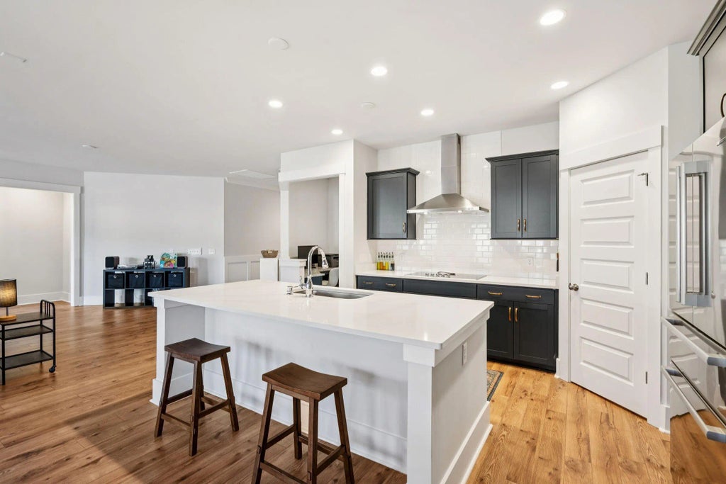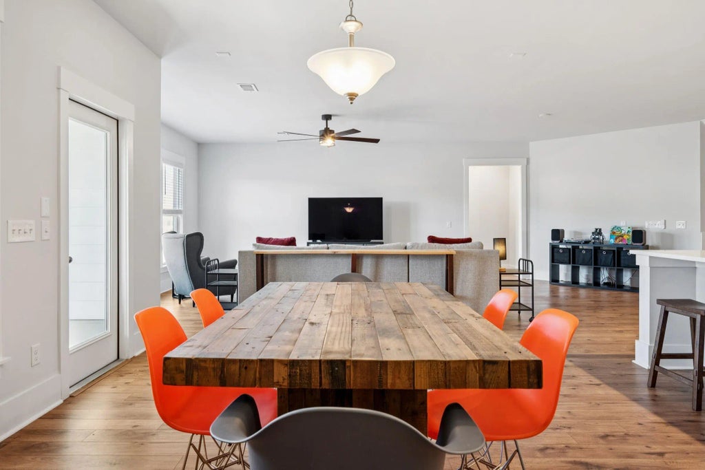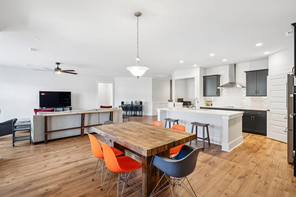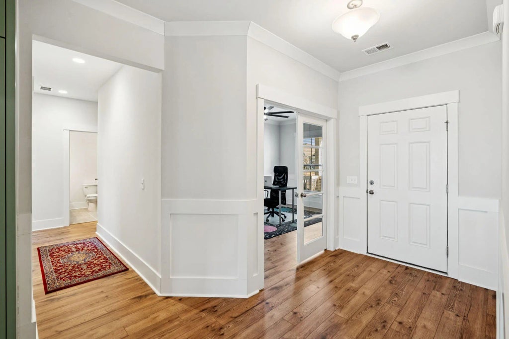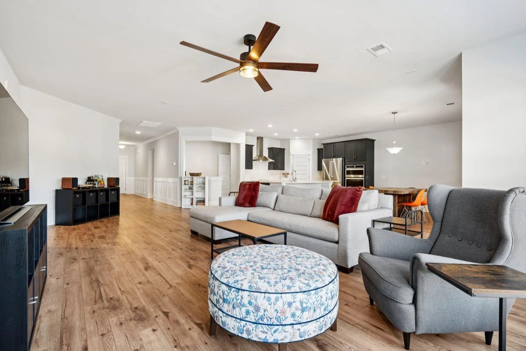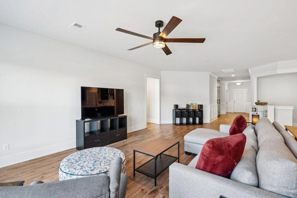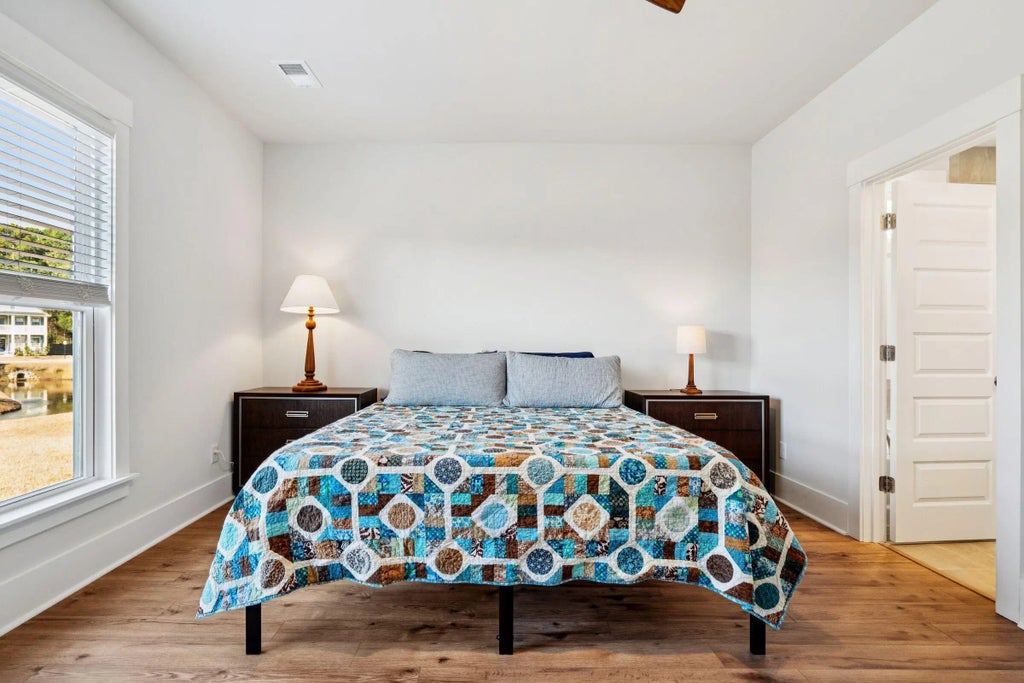 0.20 Single-story living and pond views are standout features of this 2021 Pulte-built Amberwood plan in Oakfield, introduced by an expansive covered front porch and clean coastal exterior. One of the few true one-level homes available in the neighborhood, it offers everyday convenience without stairs. A wide driveway provides generous off-street parking alongside the two-car garage, while the owners' consistent care of the lawn enhances the home's curb appeal and welcoming presence. Stepping inside, the foyer features wainscoting and custom built-in storage and opens to a private office enclosed by glass French doors. Crown molding and matching wainscoting details give the space both character and functionality, creating a comfortable work-from-home setting, library, or quiet retreat whileremaining connected to the front of the home. Just past the office, a hallway to the right leads to the secondary bedroom wing. A convenient half bath is positioned along the hall, while the corridor continues to a spacious bedroom and then turns toward a full bathroom with a double vanity and another well-sized bedroom, creating comfortable separation from the main living areas. Returning toward the foyer, the entry from the two-car garage is positioned opposite the bedroom hallway and connects to the laundry room. Both the garage and laundry include utility sinks, and the garage also features overhead storage that will remain, adding practical everyday functionality. The home then opens into the main living space where the gathering room, dining area, and gourmet kitchen connect in one continuous layout overlooking the backyard and pond. The kitchen is centered around a large island with quartz countertops, subway tile backsplash, and stainless appliances, while the four-foot rear extension enhances the living area and creates an open, comfortable space for both everyday living and entertaining. Just off the kitchen, the planning center provides a convenient workspace and leads to the flexible fourth bedroom, which can serve as a guest room, hobby or music room, playroom, second office, fitness space, or den, plus more depending on your needs. Tucked privately at the back of the home, the owner's suite overlooks the pond and includes a spacious bath with double vanity, quartz countertops, a soaking tub, and separate shower, along with a massive walk-in closet, creating a comfortable retreat separated from the secondary bedrooms. Off the main living area, a covered screened lanai and extended patio overlook the serene pond, providing a comfortable outdoor space for relaxing or gathering. Located within the Oakfield community, residents enjoy access to a neighborhood pool, clubhouse, and walking trails while remaining conveniently positioned to Johns Island dining, shopping, and routes leading toward downtown Charleston and area beaches.
